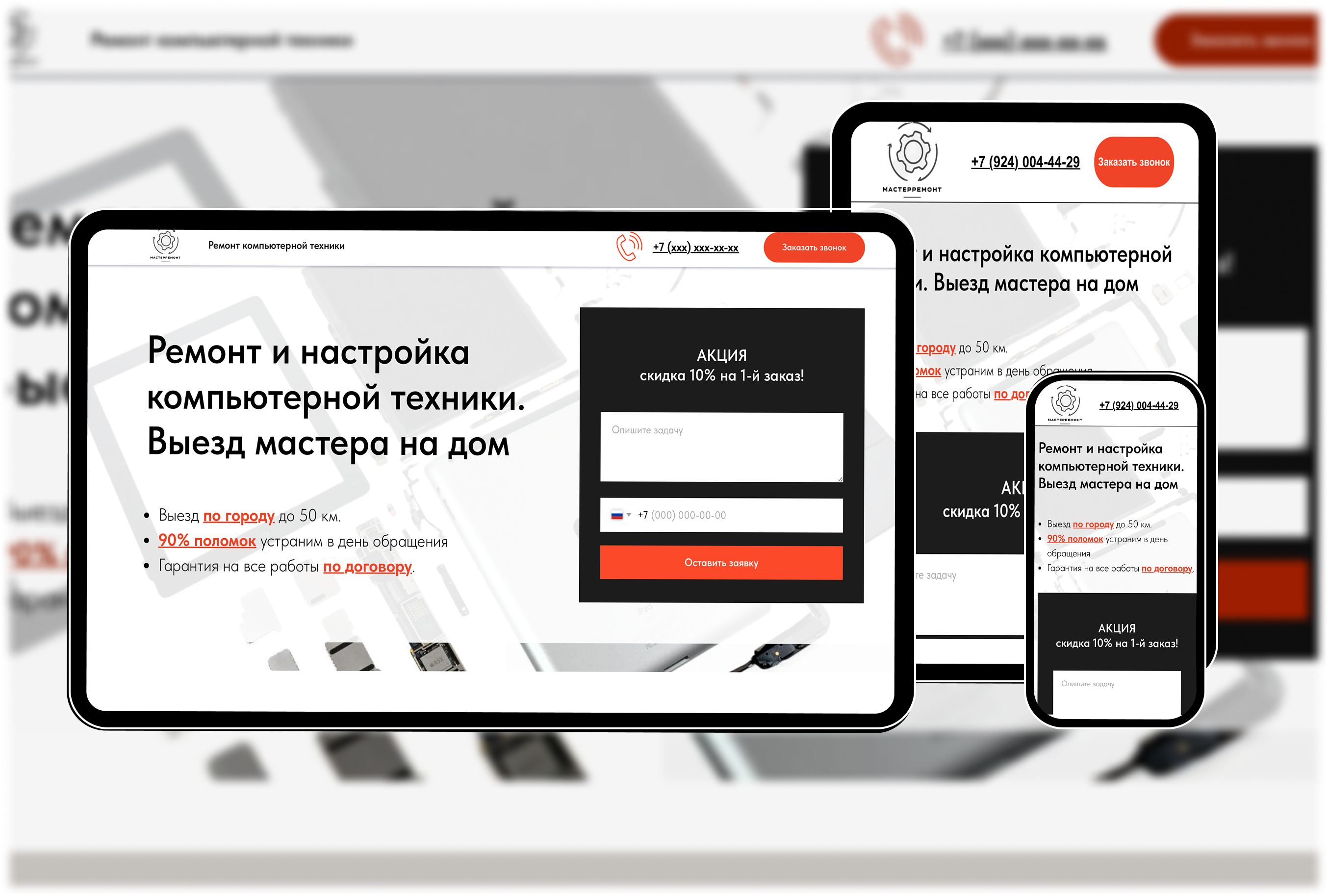 Создали яркий и технологичный дизайн, который вызывает доверие. На странице четко выделены виды ремонта (ноутбуки, ПК, срочный ремонт), прайс-лист и форма для онлайн-заявки.