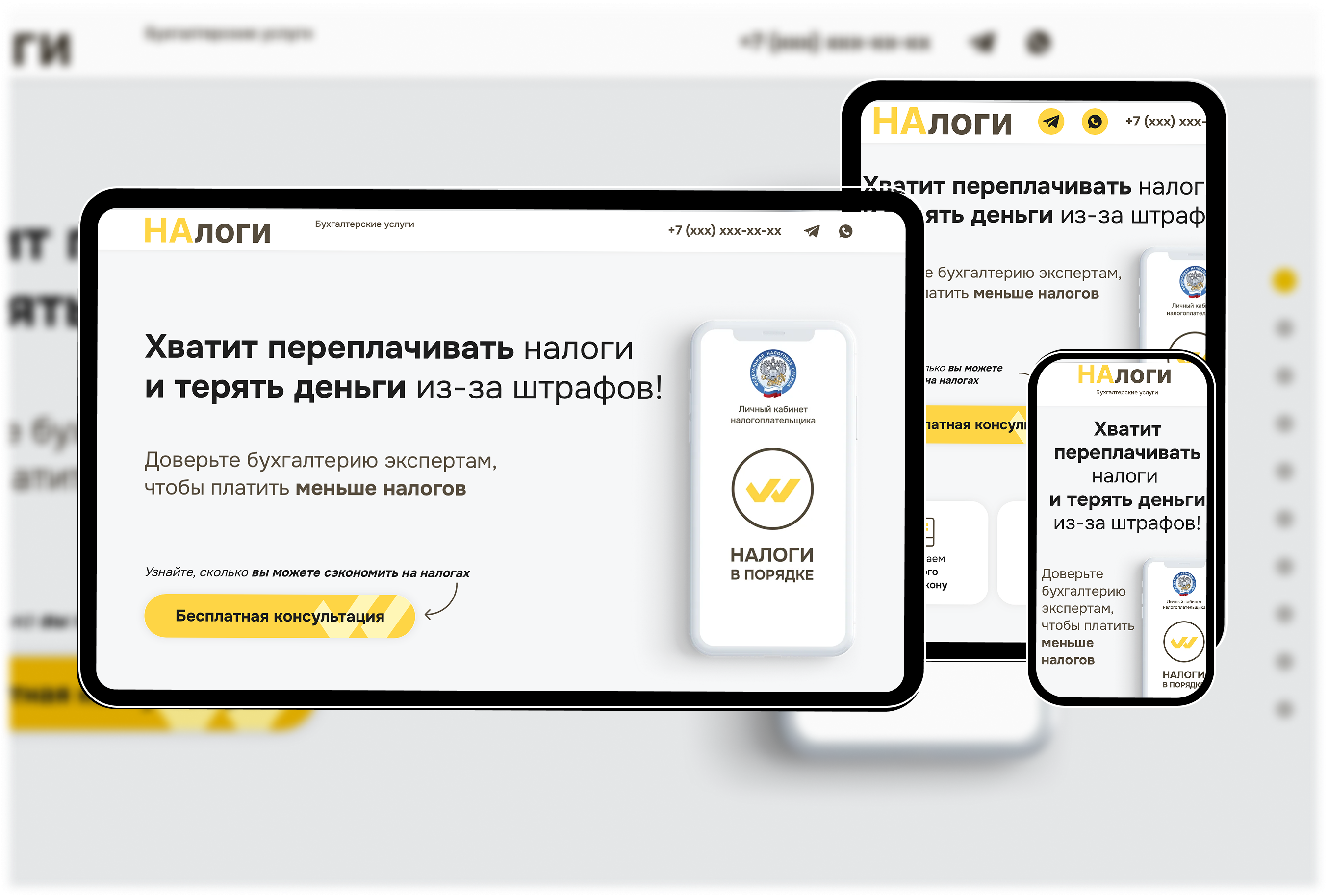 Строгий, но современный дизайн подчеркивает профессионализм и надежность. Акцент сделан на решении конкретных проблем клиентов (проверки, оптимизация, отчетность) и форме для бесплатной консультации.